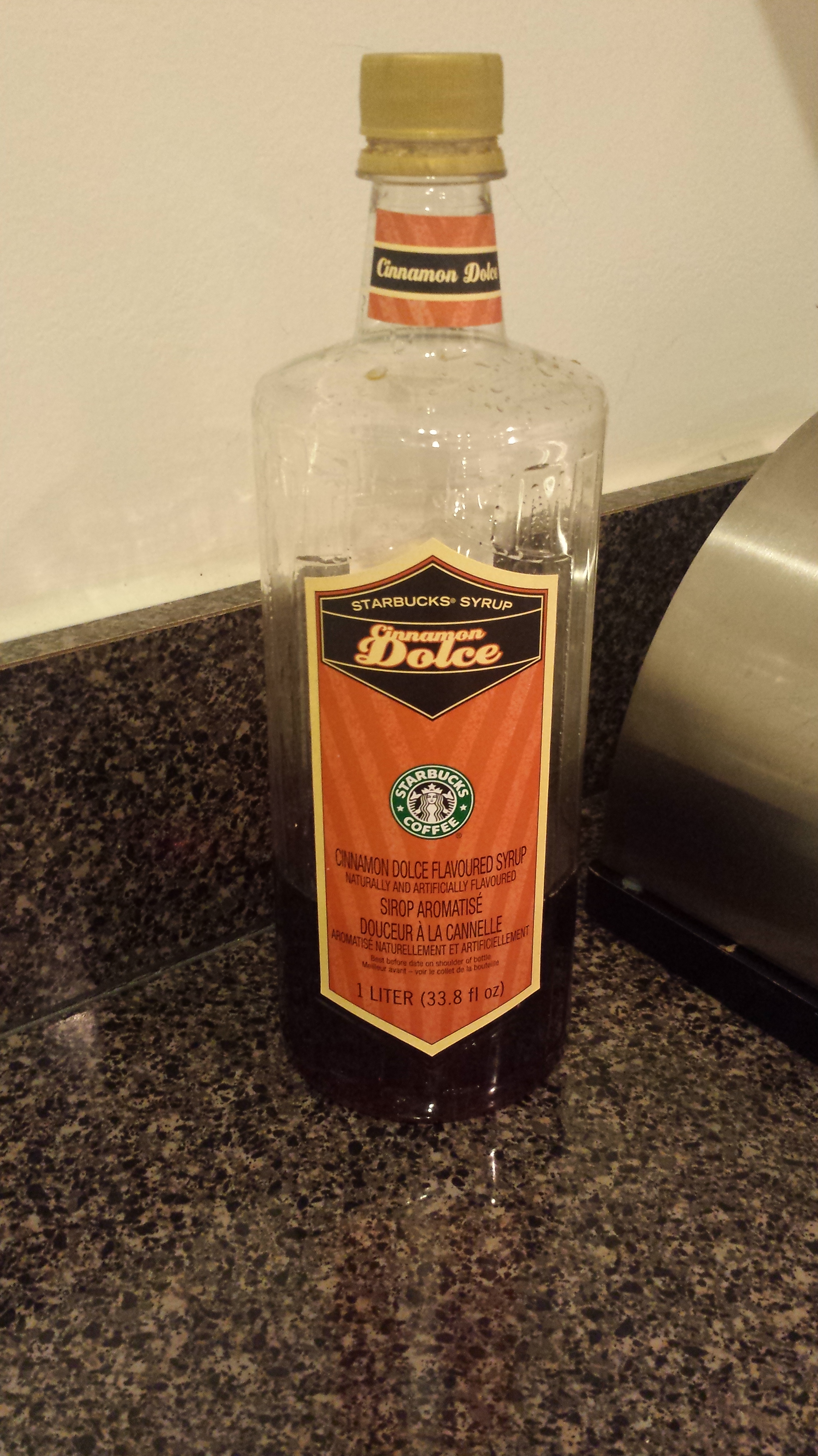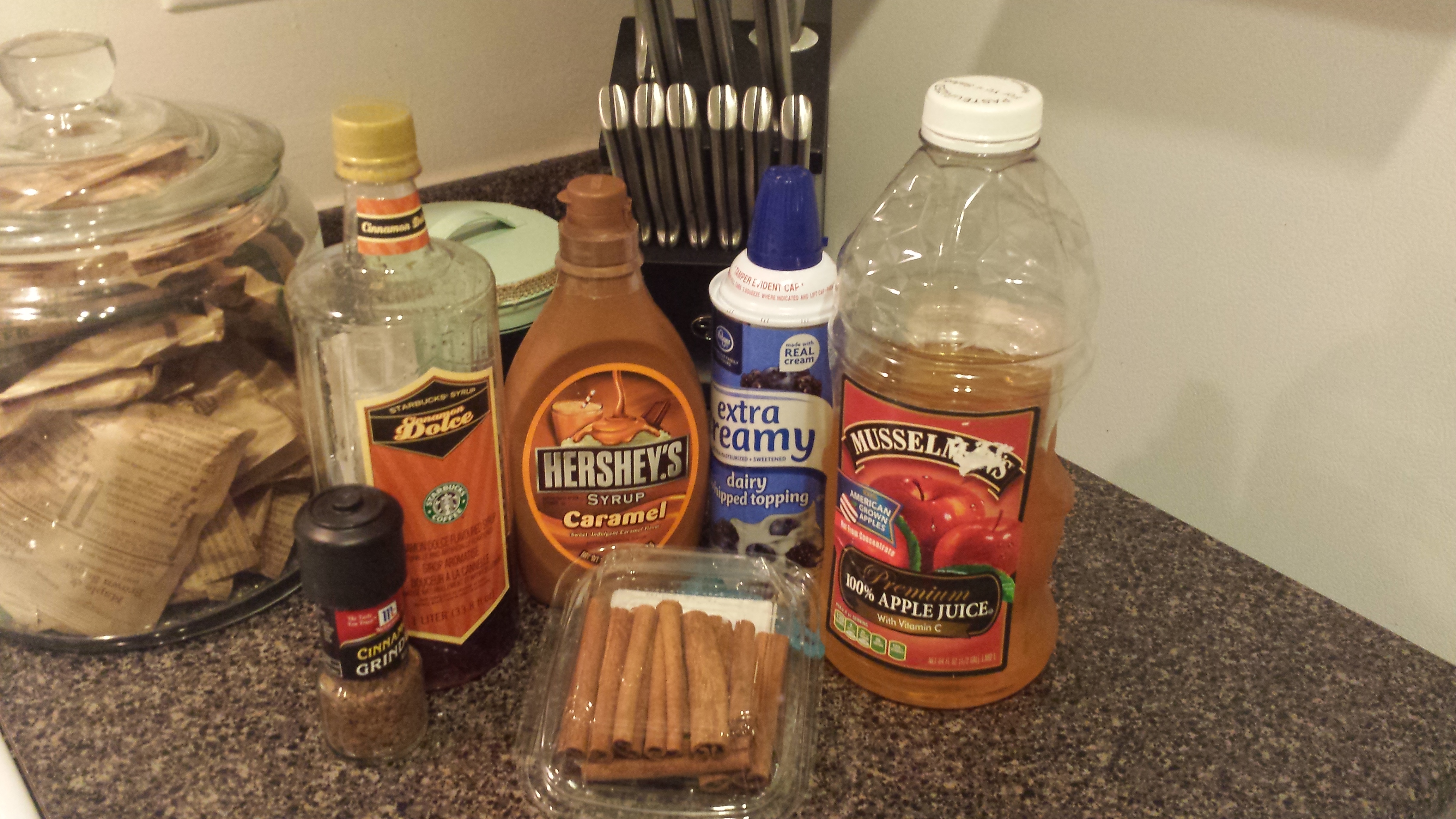 I microwaved a little over a cup of apple juice for about a minute. (Microwaves vary, so stay near and use microwave safe mugs). If you have an espresso machine, by all means be fancy and steam it! Next, add one cinnamon stick or about 2-3 pumps of cinnamon syrup. It’s really to your taste. (Not all Starbucks sell their syrups… I found one generous enough to do so! I think I paid about $16 for it, but as you can see, it will last a while). Finally, you can add your whip, caramel sauce, and ground cinnamon for taste and appeal!